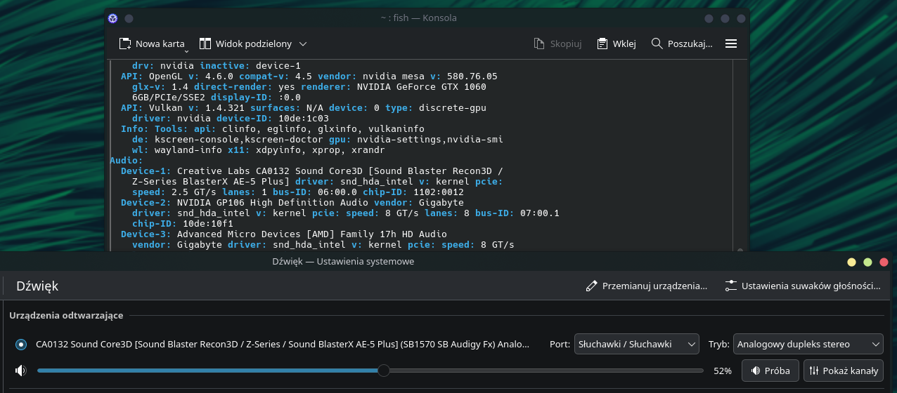 Cytat: linux4ever w Październik 07, 2025, 08:41:36 AM@Yattaman Zatem wystarczy tylko przełączyć audio i działać powinno.Tak, no i to jest dokładnie CA0132 :)